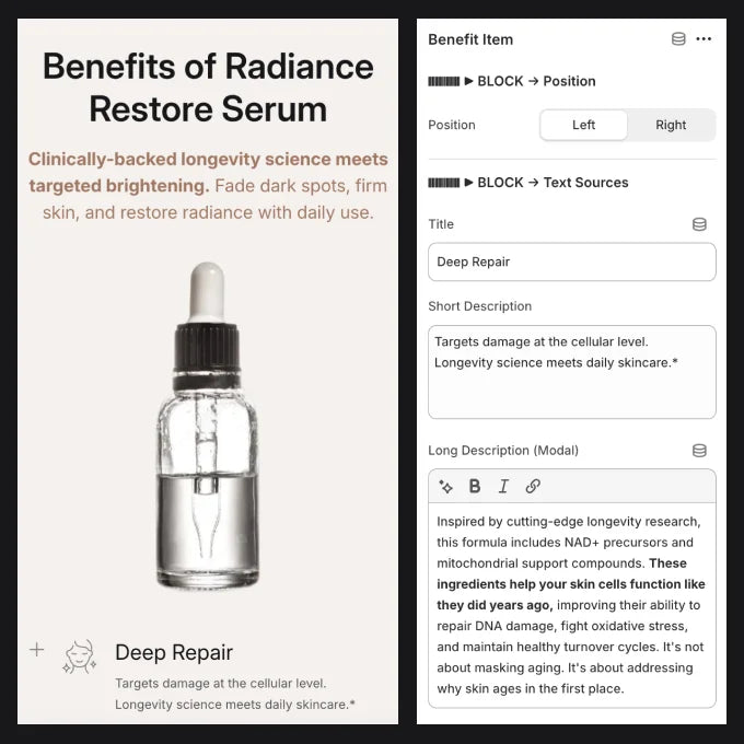 A single Liquid file that adds an interactive product benefits section to any Shopify theme. All CSS and JavaScript included in one file. Features a centered product image with benefits displayed on both sides, each with icon, title, short description, and expandable modal for detailed content. Hover states, micro-interactions, and a stylish modal window — all server-side rendered for SEO and AI visibility. No apps, no external dependencies.